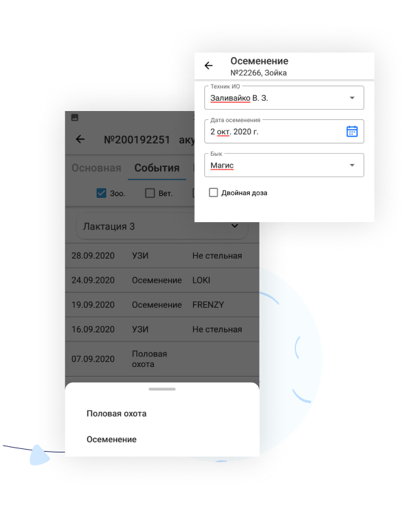 Сбор информации о животных хозяйства, удоях, взвешивании, УЗИ, осеменениях